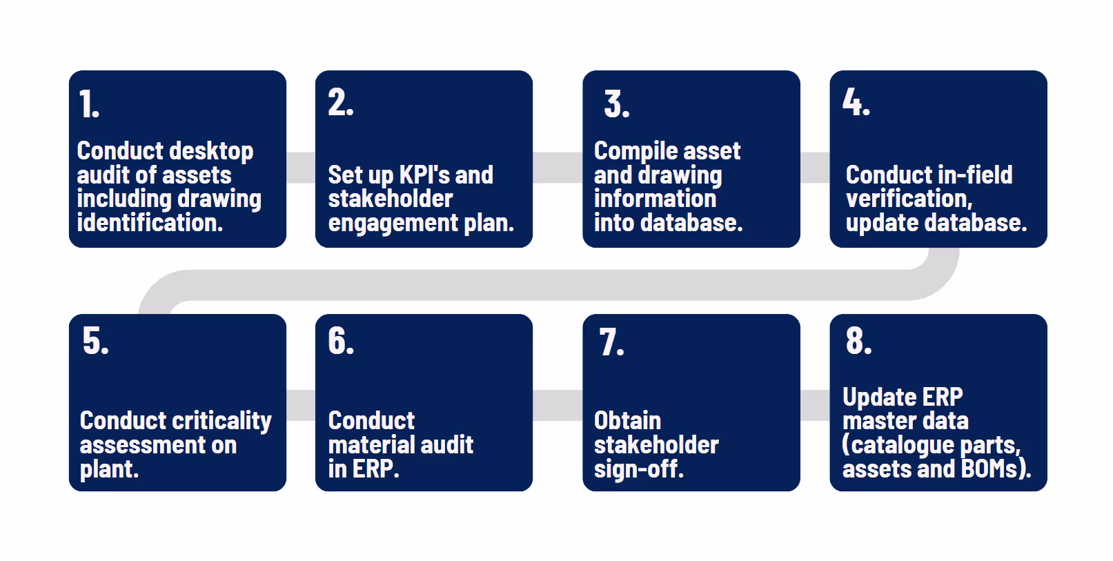 Assets are verified in-field to ensure drawings are up to date and available to maintenance personnel. Then all Materials are identified and assessed to determine criticality and catalogued in the ERP. With a portfolio of over 1700 assets across 12 plants, this body of work has spanned over 3 years, a true testament to the value of work being delivered.